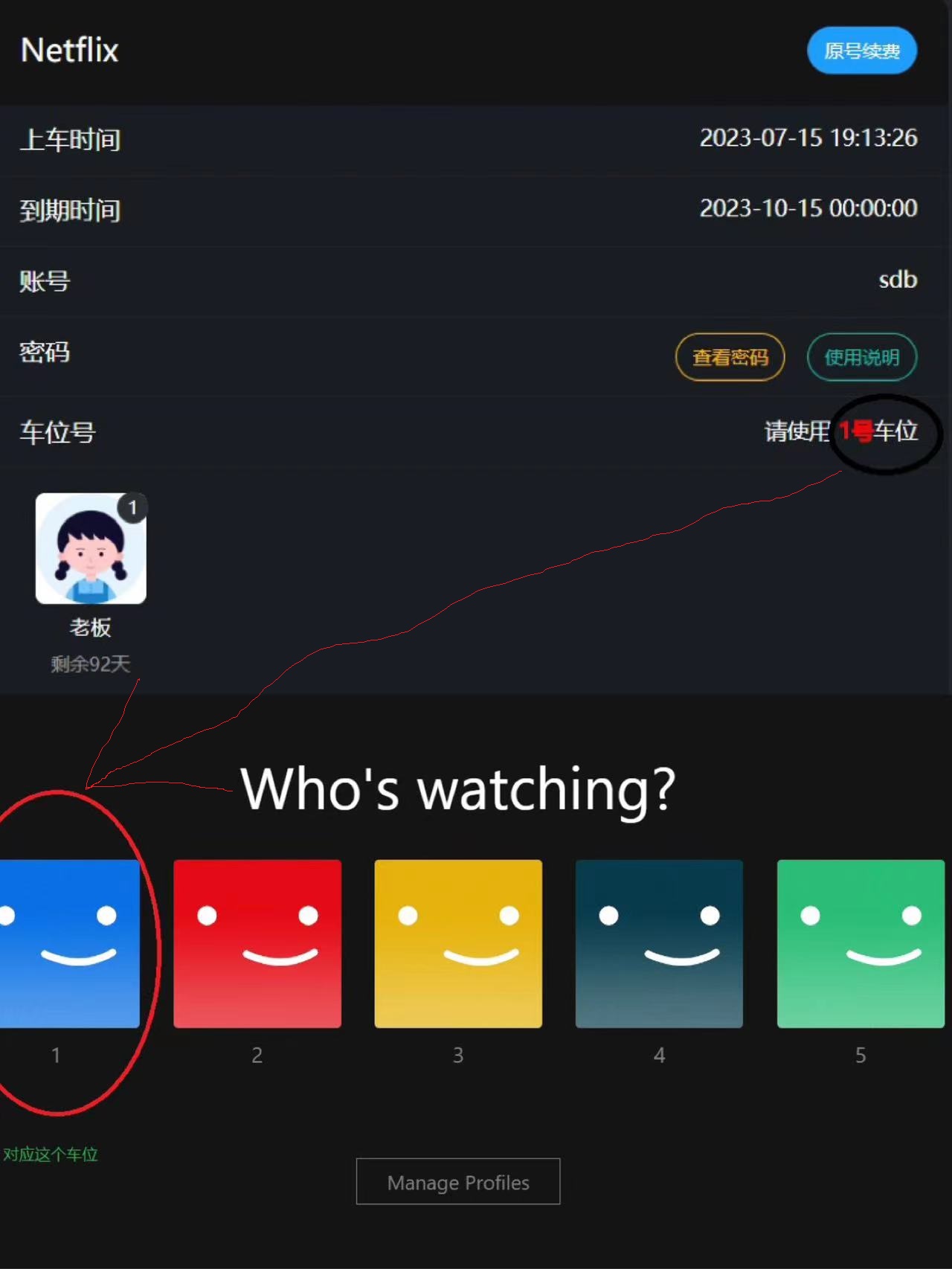 在 我的车票 页面查看购买的车票,上面有账号信息。登录Netflix后按照车票上的车位号选择对应的头像进入即可开始使用。注意:每个车位有自己独立的观影记录和推荐,不要更改车位号误导他人上错车,也不要上错车位影响到自己和他人的观影体验